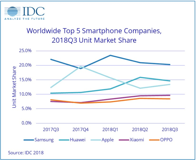 بنا به گزارش IDC وضعیت برند اول بازار گوشیهای تلفن همراه یعنی سامسونگ هم چندان خوشایند نیست. به گفته این گزارش: “سامسونگ با کاهش 13.4 درصدی فروش در دوره اخیر با چالشی بزرگ روبرو شده که باعث میشود بیش از پیش خطر شرکتهایی مانند هواوی را پشت سر خود احساس کند که برای دومین دوره پیاپی با کنار زدن اپل توانسته به عنوان دومین فروشنده اسمارتفونها در جهان، جایگاه خود را تثبیت کند.”