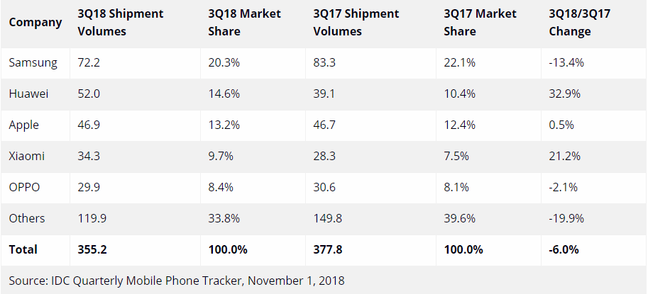 بنا به گزارش IDC وضعیت برند اول بازار گوشیهای تلفن همراه یعنی سامسونگ هم چندان خوشایند نیست. به گفته این گزارش: “سامسونگ با کاهش 13.4 درصدی فروش در دوره اخیر با چالشی بزرگ روبرو شده که باعث میشود بیش از پیش خطر شرکتهایی مانند هواوی را پشت سر خود احساس کند که برای دومین دوره پیاپی با کنار زدن اپل توانسته به عنوان دومین فروشنده اسمارتفونها در جهان، جایگاه خود را تثبیت کند.”