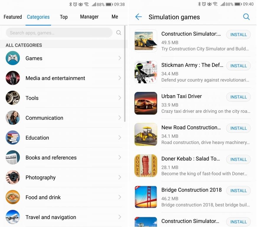 اپلیکیشن اختصاصی هواوی، AppGallery دارای 5 تب Featured (صفحه اصلی برنامه)، Category (دسته بندی برنامه ها)، Top (برنامه های پرطرفدار)، Manager (مدیریت برنامه ها) و Me (برنامه های نصب شده) می باشد. از آنجاییکه هواوی بزرگترین تولید کننده گوشی های هوشمند در چین است، تعداد زیادی از برنامه های این فروشگاه مانند Amap (مسیریابی)، WeChat (پیام رسان) و QQMusic (سرگرمی) در بازار آسیا تولید شده اند. البته شما می توانید برنامه های محبوب جهانی مانند، فیسبوک، اینستاگرام و یوتیوب را نیز در این فروشگاه پیدا کنید، اما احتمالا قبلاً آنها را گوگل پلی دانلود کرده اید.