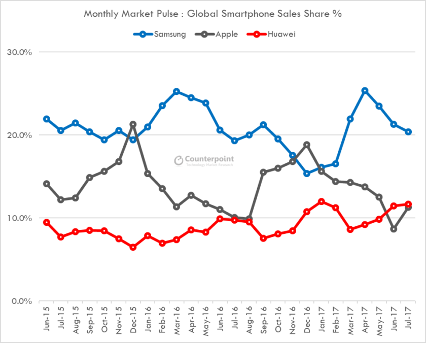 هواوی در ماه های ژوئن، جولای و به طور تقریبی در آگوست فروش بیشتری نسبت به اپل داشته است. به نظر میرسد که سهم هواوی و اپل در ماه جولای در حدود 12 درصد بوده است. هواوی از اپل سبقت گرفته است، در حالیکه سامسونگ به صدر نشینی خود با بیش از 20 درصد از سهم فروش بازار به کار خود ادامه میدهد. هواوی قبلا در دسامبر 2016 ادعا کرده بود که اپل را در عرصه فروش شکست داده است، اما این اولین بار است که شرکت تحقیقاتی بزرگی نام هواوی را بالاتر از اپل در لیست خود قرار داده است.