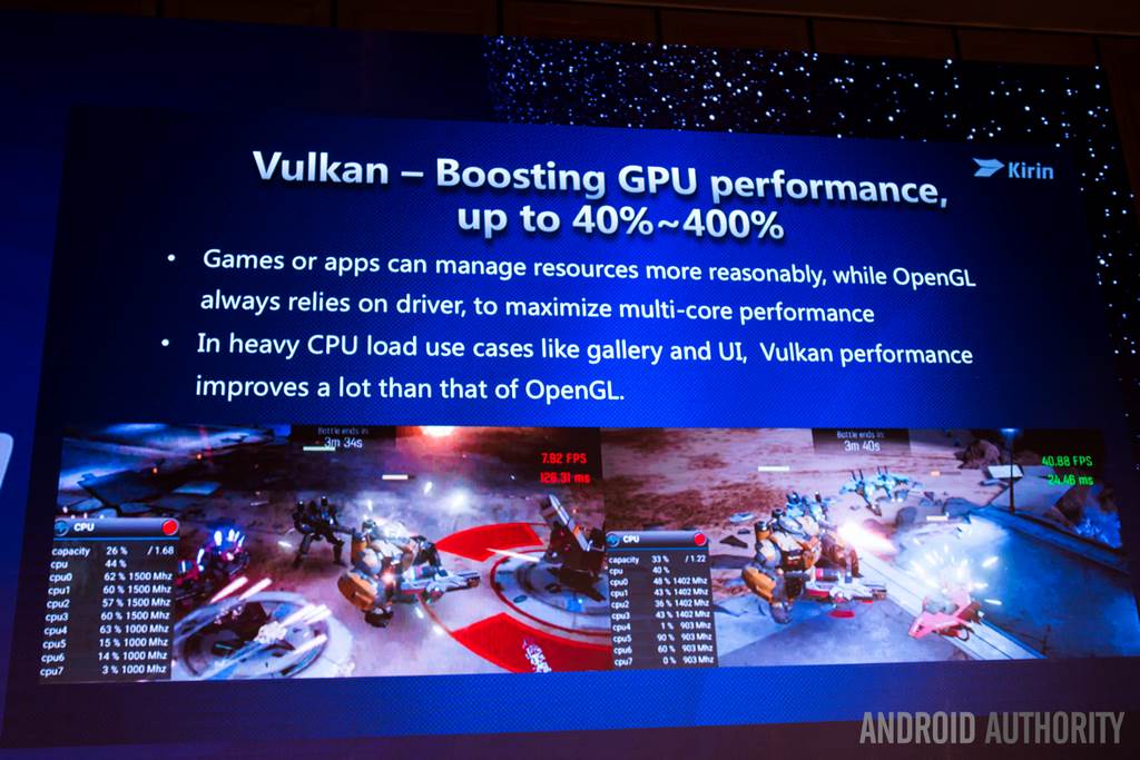 اما شاید بتوان انقلابی ترین بخش چیپ جدید هواوی را همان پردازنده ی گرافیکی Mali G71MP8 دانست. این پردازنده به طور چشمگیری نسبت به نسل قبل بهبود یافته است و عملکرد آن نسبت به نسل قبل یعنی Mali T880 چیزی حدود 180 درصد سریع تر شده است. از آنجا که این چیپست به طور کامل از فناوری Vulcan پشتیبانی میکند و باعث بهبود فریم دهی بین 10 تا 40 فریم بر ثانیه میشود، انجام بازی های سنگین بر روی گوشی های هوشمند قطعا لذت بخش تر از قبل خواهد شد. ضمن اینکه هواوی این اطمینان را به کاربران داده است که با چیپ جدید، خبری از گلوگاه شدن پردازنده نیز نخواهد بود و تاثیری بر روی تجربه ی کاربر نخواهد گذاشت. همچنین هواوی عنوان کرد که خود تستی عملی از Kirin 960 را صورت داده است و 14 اپلیکیشن محبوب در چین را تست کرده است و چیپست هواوی در اجرای 13 اپلیکیشن سریع تر از رقبا عمل کرده است.