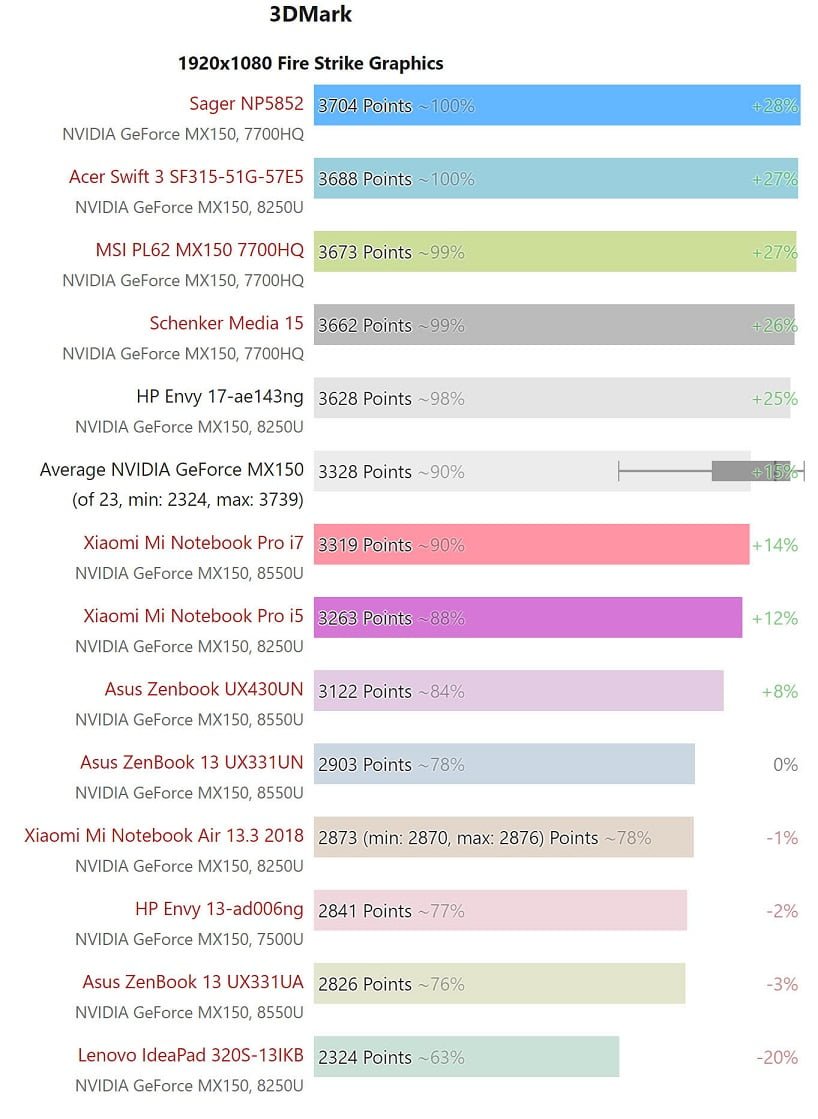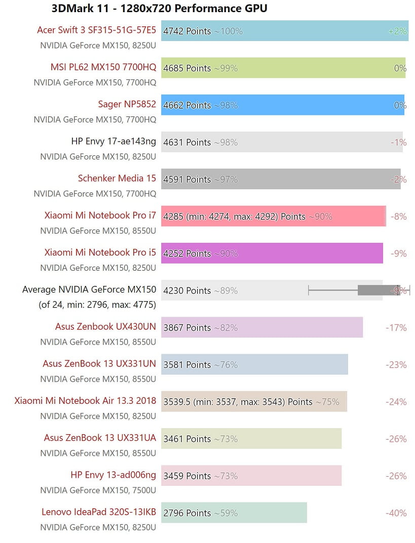 از سوی دیگر، دومین کارت گرافیک با نام 1D12 نیز دارای فرکانس های 937 مگاهرتز در وضعیت پایه، 1038 مگاهرتز در حالت افزایشی و 1253 مگاهرتز برای حافظه است. در نتیجه عملکرد آن به نسبت مدل 1D10 تا حدودی کند تر خواهد بود. نوت بوک هایی از جمله Lenovo IdeaPad 320S, ZenBook 13 UX331UN, Xiaomi Mi Notebook Air 13.3, HP Envy 13 و ZenBook UX331UA نیز مدل ضعیف تر را به همراه دارند. نوت بوک چک با استفاده از 13 نوت بوک متفاوت، تست هایی را بین این دو ورژن برگزار کرده است که همگی آنها حاکی از آن هستند که عملکرد این دو کارت گرافیک 20% الی 25% با یکدیگر تفاوت دارد. دلیل اصلی این تفاوت پرفورمنس نیز کاهش 36 درصدی فرکانس در 1D12 است. خوشبختانه 1D12 تنها در مدل های 13 اینچی به خدمت گرفته شده و باقی مدل های بزرگتر از کارت گرافیک MX150 با سیلیکون 1D10 استفاده خواهند کرد.