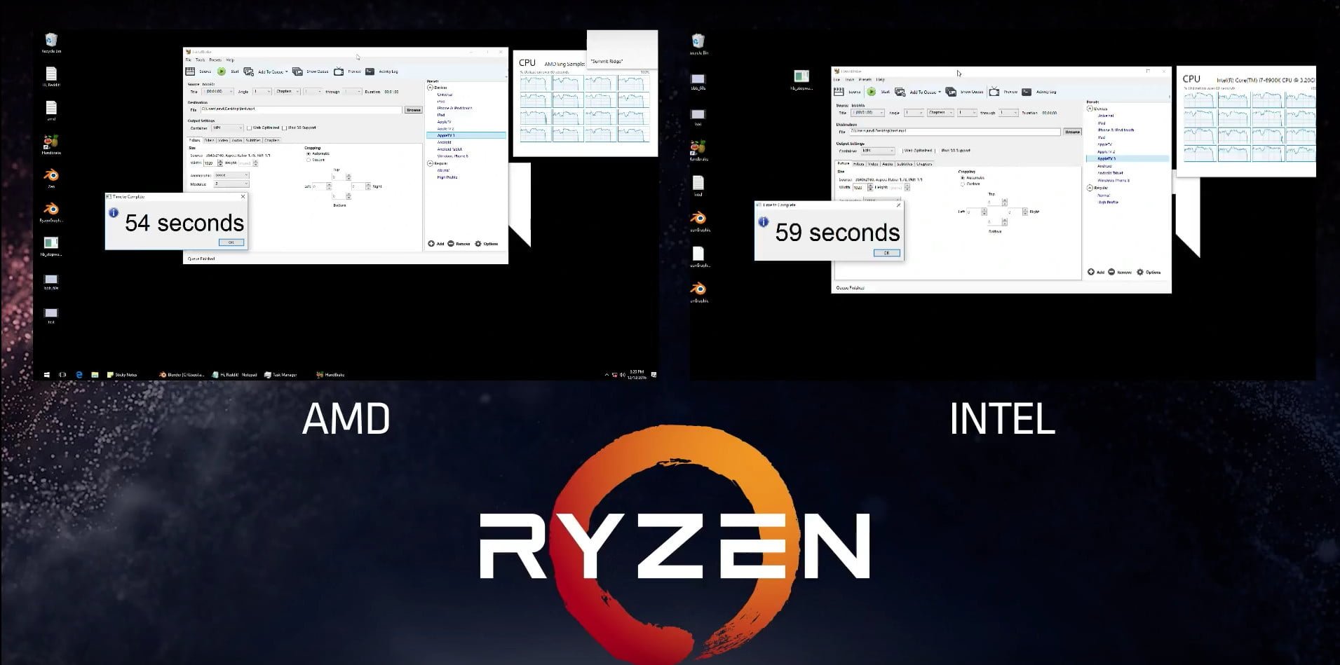 برای این مقایسه AMD یکی از پردازنده های Broadwel-Eتحت عنوان Core i7-6900K را با یکی از نمونه های (احتمالا پرچمدار) از RYZEN را در کنار یکدیگر قرار داد. پردازنده های مورد نظر در اجرای دستورات IPC یا تعداد دستورات پردازش شده در هر سیکل کامل، تا 40% درصد بهتر از آخرین معماری AMD عمل خواهند کرد.  به عنوان نخستین مقایسه، بنچمارک Blender این دو پردازنده را به چالش دعوت نمود؛ خروجی بسیار جالب توجه بوده و هر دو پردازنده عملکردی یکسان را به نمایش گذاشتند. این در حالی بود که پردازنده های مورد نظر در فرکانس پایه به رقابت پرداخته و اینتل پردازنده Core i7-6900K را با قیمت 1100 دلار عرضه می کند. اشاره ی خانم لیزا سو به قیمت این پردازنده، انتظار برای صحبت بر سر قیمت های RYZEN را افزایش داد، با این وجود ایشان صحبتی در این زمینه انجام ندادند. پردازنده Core i7-6900K با توان حرارتی 140 وات در بازار است و RYZEN رقیب توان حرارتی 95 وات را به نمایش گذاشت. مسئله تهویه و حفظ دمای پردازنده نیز بسیار حائز اهمیت است؛ AMD بارها بر سر TDP به حاشیه کشیده شده بود.