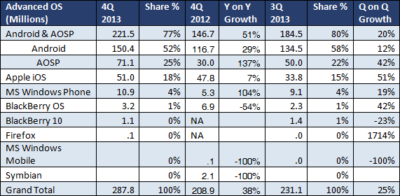 تعداد محصولات به فروش رفته نسبت به سال گذشته به میزان 25 درصد افزایش یافته و به تعداد 287.5 میلیون دستگاه رسیده است. با این حال شاهد کاهش سهم سیستم عامل اندروید از 80 درصد به 77 درصد رسیده، این در حالیست که ویندوز فون به افزایش 19 درصدی میزان فروش در مدت تنها سه ماه پایانی سال 2013 دست یافته است. در حالی که در سال 2012، سیستم عامل اندروید به افزایش میزان فروش 52 درصدی دست یافته و سیستم عامل ویندوزفون و محصولات آن موفق به ثبت رشد میزان فروش تنها 4 درصدی گردیده است.