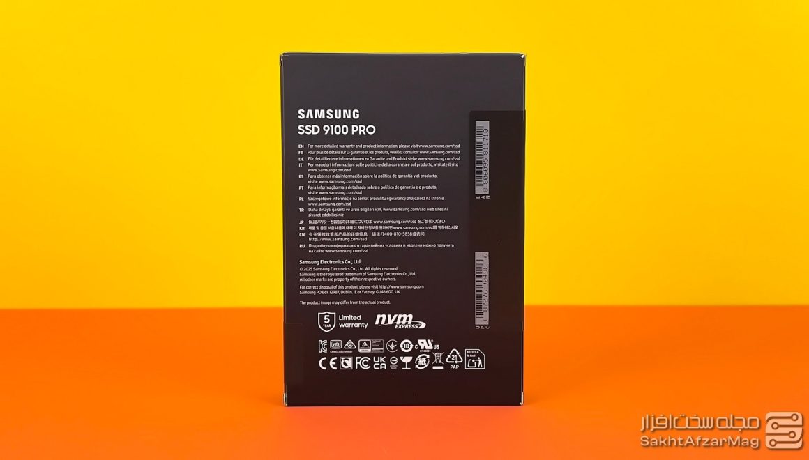 در پشت جعبه، نشان پروتکل NVMe و همچنین استانداردهای جهانی دریافت شده توسط اساسدی سامسونگ چاپ شده است.