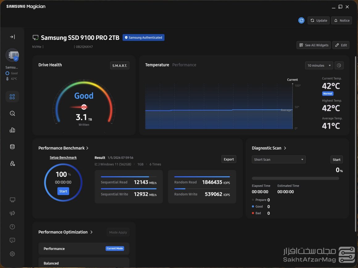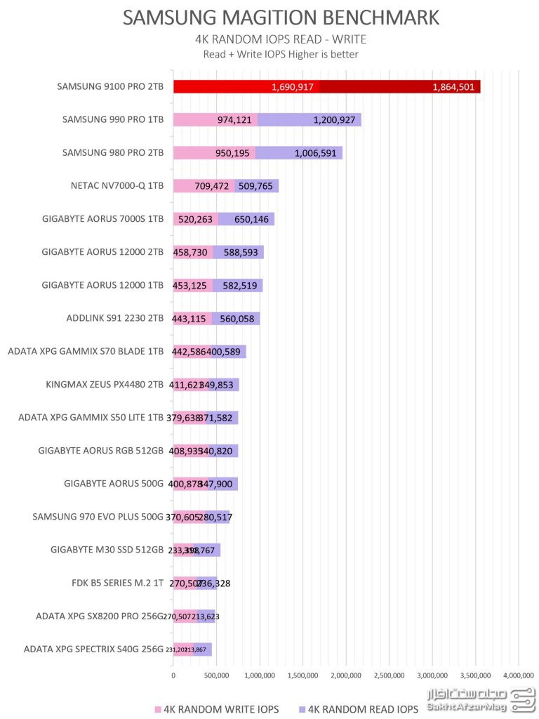 به سراغ بنچمارک داخل نرمافزار Samsung Magician میرویم تا سرعت خوانش و نوشتار اتفاقی را ثبت کنیم. در این بنچمارک، 9100 Pro بافاصله زیاد در جایگاه اول ایستاد. این سرعت در عملکرد گیمینگ، اداری، و عملکرد روزانه سیستم نقش مهمی ایفا میکند.