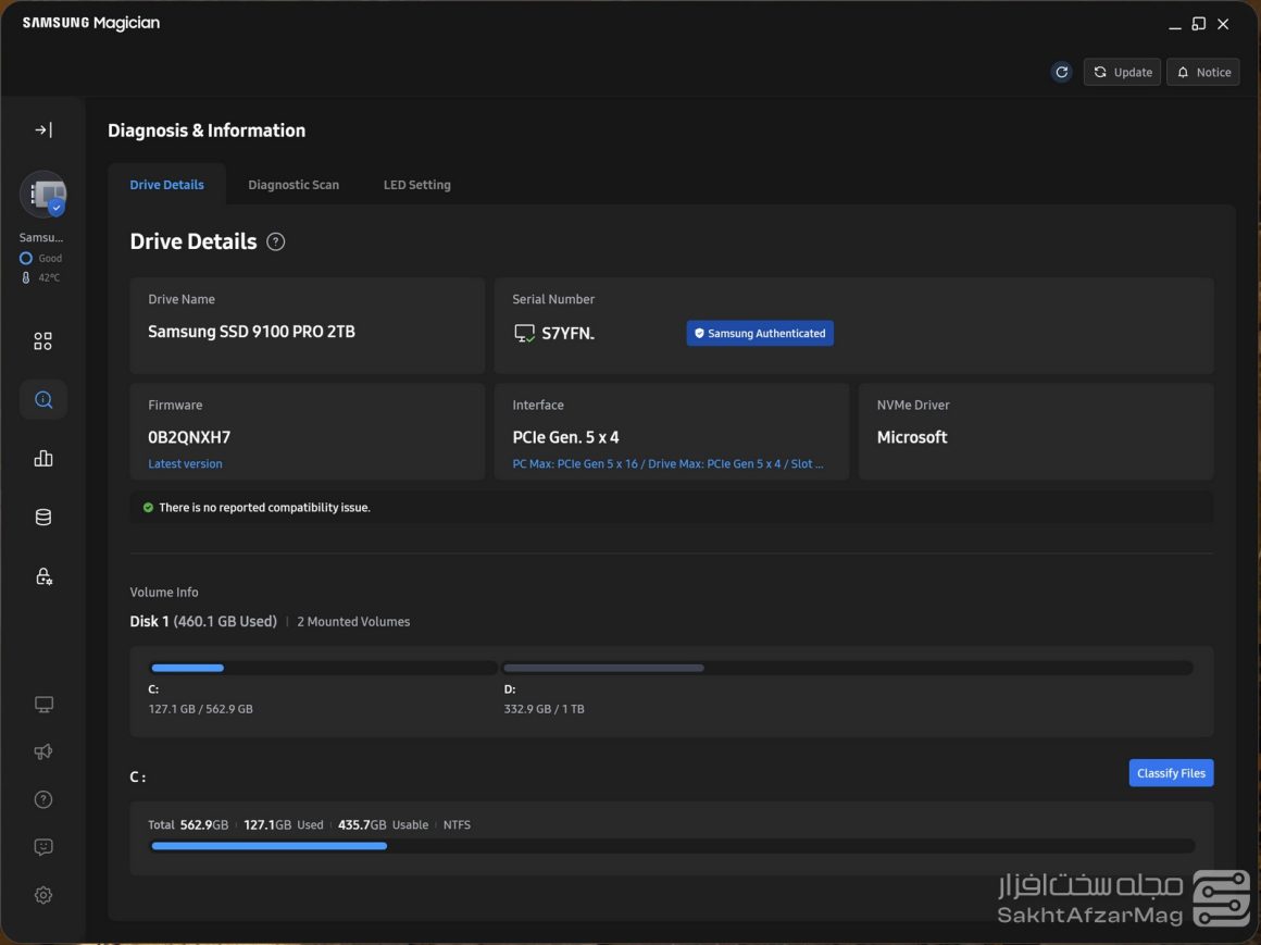 نرمافزار Samsung Magicion که از بخشهای متنوعی تشکیل شده است را میتوانید از وبسایت رسمی سامسونگ دانلود و استفاده بفرمایید. در صفحه اول داشبورد این نرمافزار، سلامتی و شرایط دمایی حافظه به نمایش گذاشته میشود.