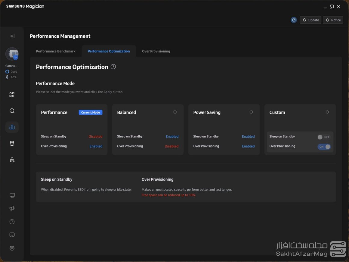 اما مهمترین بخش این نرمافزار Performance Optimization است که با اهرمی میتوان حالات Custom، Power Saving، Standard، و Performance را انتخاب کرد. توصیه میکنیم شما همیشه حالت Performance را انتخاب کنید. البته برایآنکه عدالت در تست حافظهها برقرار باشد ما برای تست این اساسدی آن را بر روی حالت Standard قرار میدهیم.