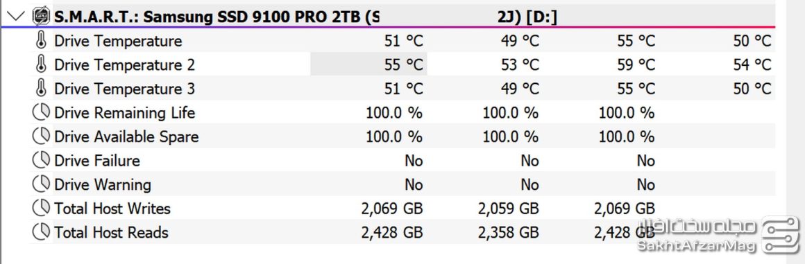 در برنامه HWINFO تعداد 3 سنسور دما از اس اس دی 9100Pro سامسونگ نمایش داده میشود. سنسور اول مربوط به حافظه Nand است، سنسور دوم دمایی است که شرکت سازنده از این حافظه گزارش میکند، و سومین سنسور، دمای کنترلر SSD است. معیار ما برای سنجش دما سنسور اول یا دوم است که همانطور که در تصویر مشاهده میکنید در حالت عادی دمای این حافظه، حدود 49، و تحت لود به 59 درجه میرسد.