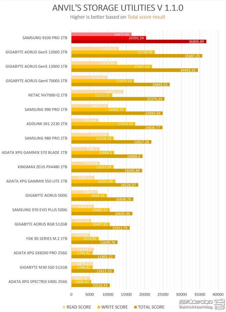 نرمافزار Anvil یکی از بنچمارکهای محبوب اساسدی است. این تست یکی از بهترین ابزارها برای سنجش سرعت و توانایی SSD است که میتواند انواع سناریوهای کاربری را بر روی اساسدی بررسی کند و سرعت درایو را اندازهگیری کند. در این نرمافزار از حاصلجمع امتیاز خوانش و نوشتار، نتیجه Total Score به دست میآید. در این بنچمارک، اساسدی 9100 Pro سامسونگ توانست در جایگاه اول جدول Anvil قرار گیرد.