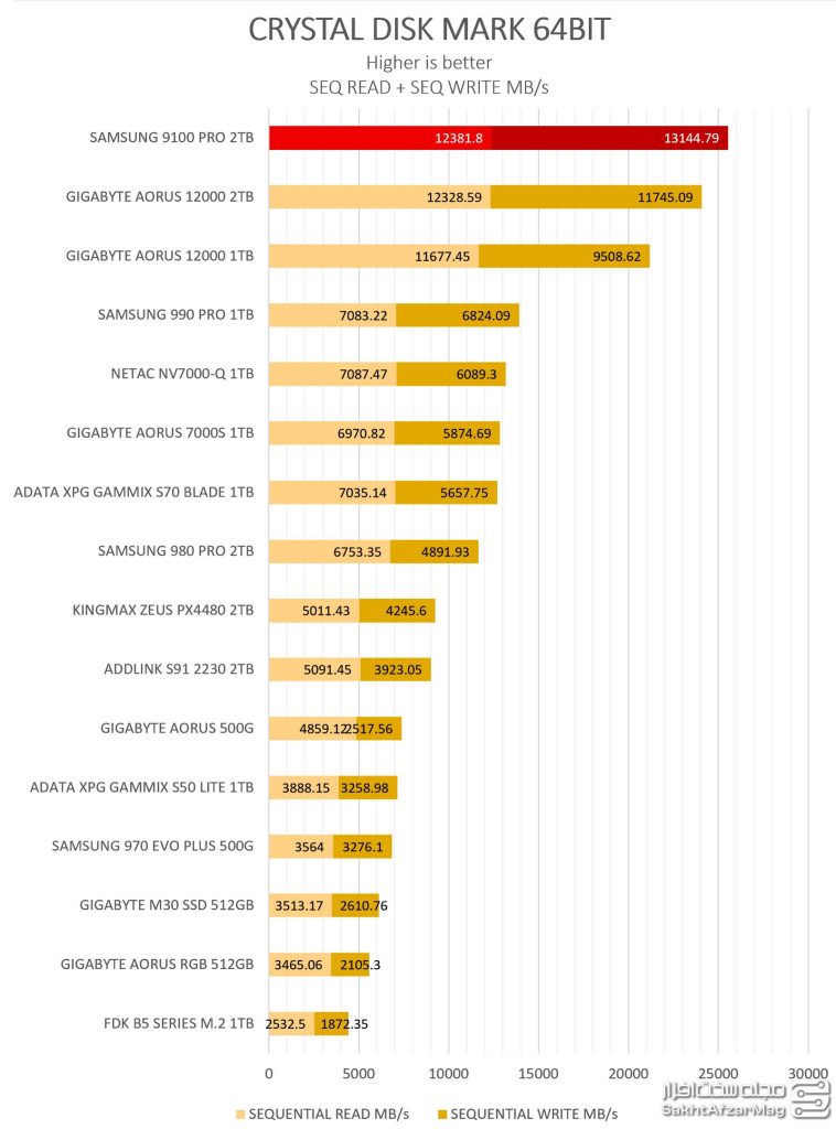 اساسدی 9100 Pro سامسونگ مبتنی بر درگاه PCIe Gen.5 x4 است. پهنای باند اسمی PCIe Gen.5 X4 تقریباً برابر 16000 مگابایت در ثانیه است که البته نهایت سرعتی که واقعا میتوان در عمل به آن دست یافت حدود 14000MB/s است. تازه این سرعت فقط بر روی پلتفرمهای AMD دستیافتنی است و روی پلتفرم اینتل، تنها میتوان به سقف 13000MB/s نزدیک شد. به دلیل آنکه سیستم تست ما اینتل است، بنابراین نهایت سرعت در دسترس درگاه ما حدود 13000MB/s خواهد بود.
