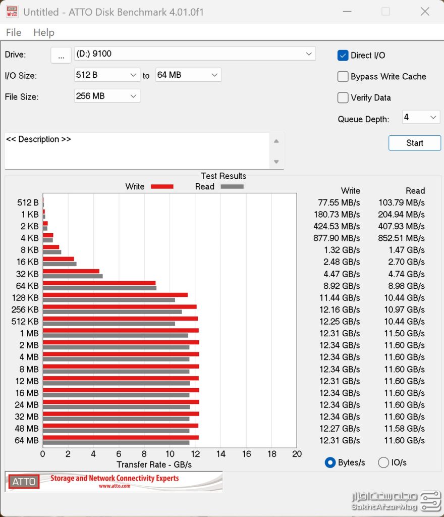 در نتیجه تست حافظه سامسونگ در نرمافزار ATTO Disk Benchmark سرعت به طور مطلوبی در طول استفاده تحت شرایط سنگین حفظ شده، و نتیجه فوق به دست آمد.