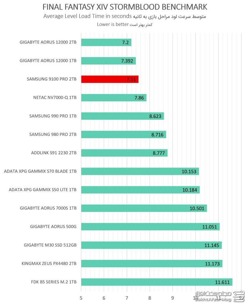 ازآنجاییکه SSD ها در عملکرد گیمینگ، در بخش لود مراحل بازی نقش ایفا میکنند، برای درایوهای PCIe Gen.5 ما تست سرعت لود مراحل بازی در Final Fantasy را انجام دادیم. اساسدی 9100 Pro در این تست با سرعت بسیار عالی در جایگاه سوم ایستاد.