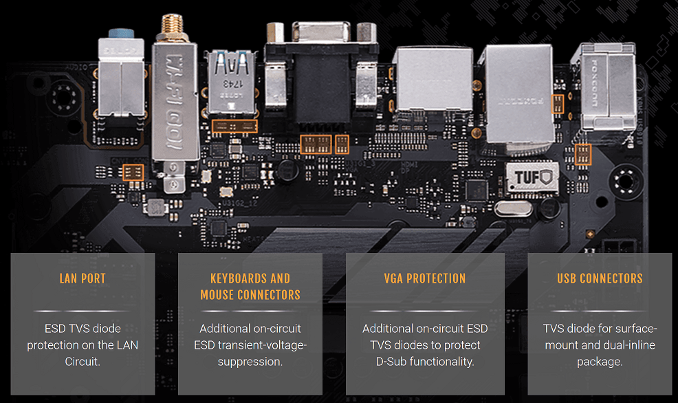 ایسوس از راهکار ESD GUARDS در تمام ورودی/خروجی های مادربورد استفاده کرده و به همین جهت، مادربوردهای ایسوس مشکلی با تخلیه ناگهانی الکتریسیته ساکن در قسمت های حساس نخواهد داشت!