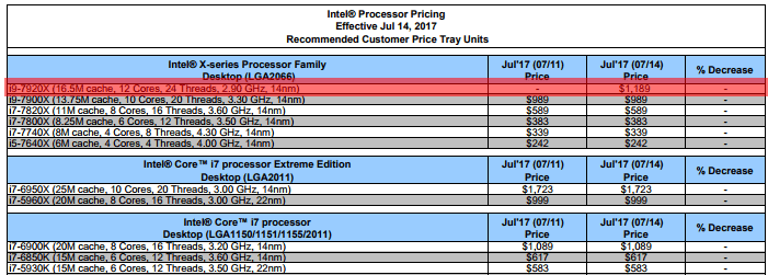پردازنده دوازده هسته ای Core i9 7920X با 400 مگاهرتز فرکانس پایین تر