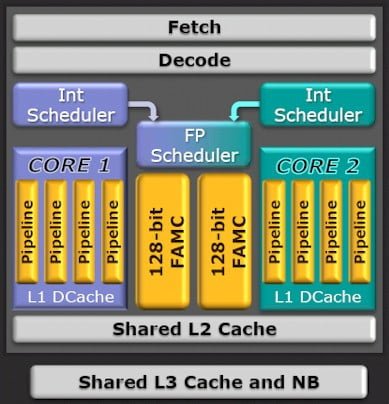 از جمله موارد مشترک در بین هسته ها می توان به Front-End، Branch-Predictor، مقدار 64 کیلوبایت کش سطح یک، 2 مگابایت کش سطح 2 و از همه مهمتر FPU اشاره کرد. مشکل اصلی از آنجایی آغاز می شود که سیستم عامل هایی نظیر ویندوز، تمامی 8 هسته این CPU را به رسمیت نشناخته و تنها از نیمی از هسته های آن استفاده می شود. به عبارت بسیار ساده، OS و هسته سیستم عامل برخوردی با FX-8150 دارد که با یک پردازنده 4 هسته و 8 رشته ای دارد.