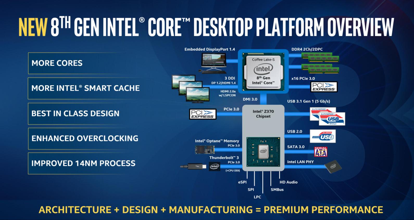 این پردازنده ها در مادربردهای مبتنی بر چیپست Z370 جای خواهند گرفت و همگی در تاریخ 5 اکتبر (13 مهم ماه جاری) در دسترس هستند. افزون بر آن، پشتیبانی از حافظه های DDR4 با فرکانس 2666 مگاهرتز و پشتیبانی غیر چیپستی (متکی به CPU) از 40 مسیر PCI Express نیز برای آنها در نظر گرفته شده است.