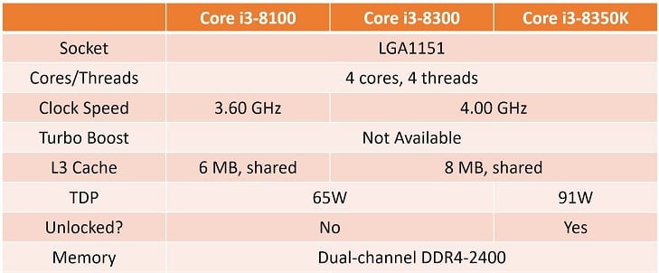 اما به تازگی یک اسلاید جدید از سوی اینتل منتشر شده است که نشان دهنده پردازنده های بیشتر از Core i3 با همین تعداد هسته است. پردازنده Core i3-8100 دومین محصولی است که از 4 هسته بهره برده و دارای فرکانس 3.6 گیگاهرتز است. این محصول دارای 6 مگابایت حافظه کش است. همچنین دومین محصول با نام Core i3-8350K نیز ضمن دارا بودن همین تعداد هسته، از قابلیت اورکلاک و 8 مگابایت حافظه نهان در کنار فرکانس 4.0 گیگاهرتز بهره می برد. Core i3-8350K دارای توان حرارتی 91 وات است و دو مدل دیگر نیز توان حرارتی 65 وات است. فرکانس پایه ی رم DDR4 در این مدل ها نیز 2400 مگاهرتز عنوان شده است. این تراشه ها فاقد ویژگی Turbo Boost هستند که احتمالا برای حفظ فاصله پرفورمنس آنها با پردازنده های Core i5/i7 است.