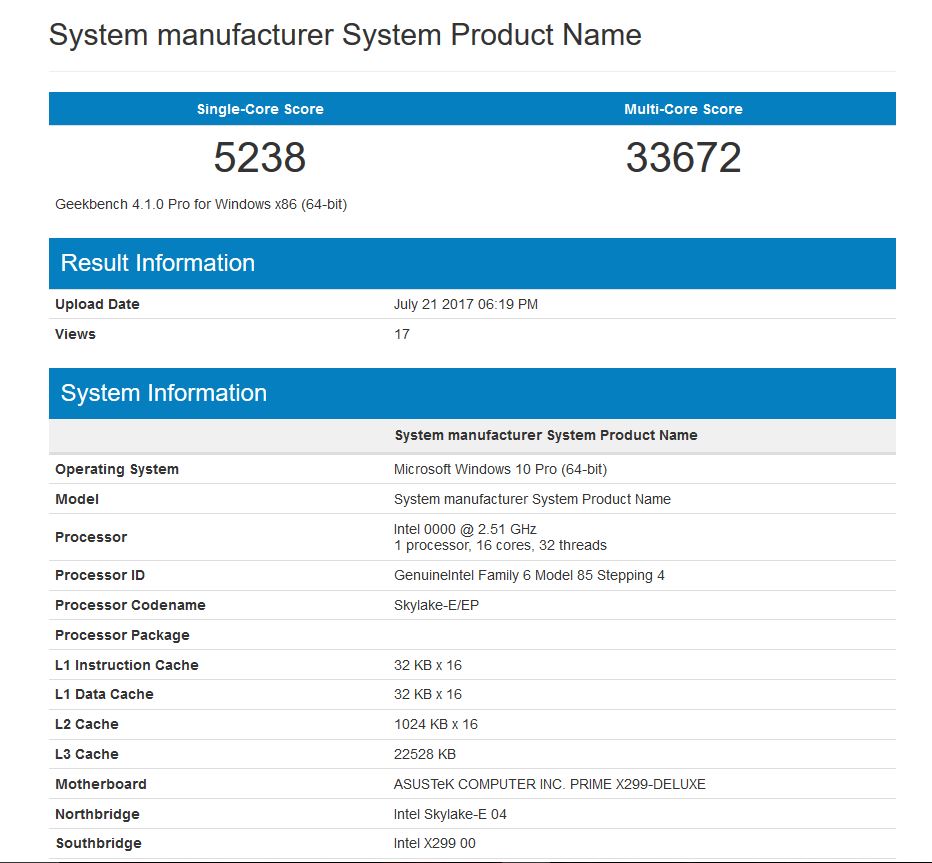 Core i9-7900X دارای 10 هسته و 20 رشته پردازشی است و این در حالی است که Intel Core i9-7960X با 6 هسته و رشته بیشتر، باید به مراتب عملکرد بسیار بالاتری را ارائه دهد. یکی از دلایل این مسئله آن است که Intel Core i9-7960X در فرکانس کمتر، 2.5 گیگاهرتز فعال است. دلایل این فرکانس کمتر هم می تواند جلوگیری از فرکانس Boost و یا نمونه مهندسی باشد. این بنچمارک که تصاویر آن نیز در متن قرار دارد، در تاریخ 21 ژوئیه 2017 منتشر شده است. سیستم تست نیز سخت افزارهایی به شرح زیر دارد.: