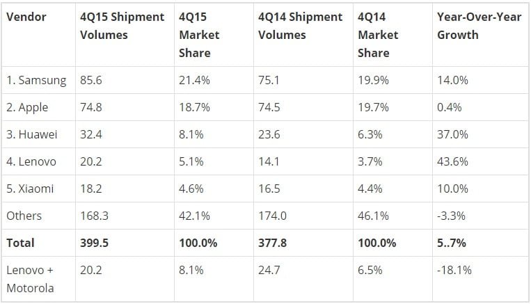 همچنین توجه به این جدول می تواند نشانه های دیگری را نیز آشکار کند. اینکه سهم هواوی به مقدار چشمگیری در سه ماهه پایانی سال 2015 افزایش داشته که می تواند نشانه ای بر قدرت گرفتن بیشتر این کمپانی در بازار چین و در نهایت بازار جهانی باشد. در کنار این مورد بد نیست نگاهی به بخش دیگری از این گزارش بیندازیم که مشخص کننده رشد شرکت ها در مقیاس بین المللی در سه ماهه پایانی سال است. بر این اساس هواوی توانسته است رشد 37 درصدی را نسبت به سال قبل تجربه کند در حالی که رشد سامسونگ 14 درصد و رشد اپل تنها 0.4 درصد بوده است. همچنین سهم کمپانی هواوی از بازار در سه ماهه پایانی سال 2015 نسبت به سال قبل از 6.3% به 8.1% رسیده و سهم سامسونگ نیز در همین بازه زمانی از 19.9% به 21.4% افزایش داشته است. در حالی که سهم اپل از بازار از 19.7% به 18.7% کاهش پیدا کرده.