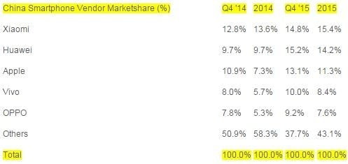 شاید در پاسخ به سوال مطرح شده اولین گزینه ای که به ذهن می رسد سامسونگ باشد. این شرکت کره ای در سال های اخیر به رشد خود ادامه داده و توانسته است رقیب اصلی خود یعنی اپل را هم به خصوص در بازار کشور چین به چالش بکشد. همچنین خود کمپانی اپل نیز پس از ورود به بازار چین سرمایه گذاری هنگفتی را بر روی بخش تبلیغاتی در این کشور انجام داد تا بتواند از این بازار پر جمعیت سود کلانی به دست آورد. اما سال 2015 را باید سال خیزش کمپانی های کوچک تر دانست. کاهش چشمگیر قیمت ها از سوی دو شرکت شیائومی و وان پلاس در کنار ارائه سخت افزارهای روز دنیا باعث جلب توجه بسیاری از کاربران به این دو شرکت شد. همین نکته در گزارش موسسه IDC نیز نمود پیدا می کند. بر اساس آمار منتشر شده، بیشترین سهم از بازار کشور چین متعلق به شیائومی است. سهم 15.4% شیائومی از بازار را می توان به راحتی به همین موارد ذکر شده ارتباط داد. پس از شیائومی این هواوی است که با 14.2% سهم در رتبه دوم قرار داشته و جالب آنجا که پس از این دو شرکت، اپل با 11.3% سهم بازار قرار دارد. اما نکته جالب تری هم در این گزارش وجود دارد و آن اینکه سامسونگ هیچ جایی در بین 5 شرکت اول بازار چین ندارد و رتبه های بعدی به Vivo و Oppo اختصاص یافته است.