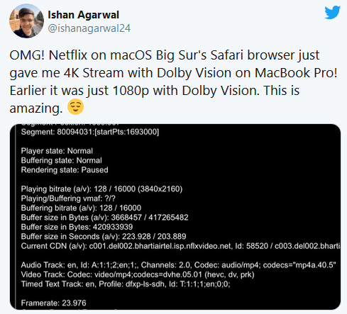 اگر از دارندگان Mac هستید به احتمال زیاد بیشتر کارهای اینترنتی خود را با مرورگر Safari انجام می‌دهید. پشتیبانی Safari از رزولوشن 4K نتفلیکس باعث شده است تا کاربرانی که از این پلتفرم برای تماشای فیلم و سریال استفاده می‌کردند قادر باشند با نهایت کیفیت به تماشای فیلم و سریال‌های مورد علاقه خود بنشینند. نتفلیکس درحال حاضر بیشتر فیلم و سریال‌های خود را با کیفیت 4K در اختیار کاربران قرار می‌دهد اما متاسفانه استریم کیفیت 4K توسط کامپیوتر‌های MacOS امکان پذیر نبود. اما خوشبختانه به نظر می‌رسد که این مورد با ارائه سیستم عامل MacOS Big Sur به طور کامل تغییر خواهد کرد.