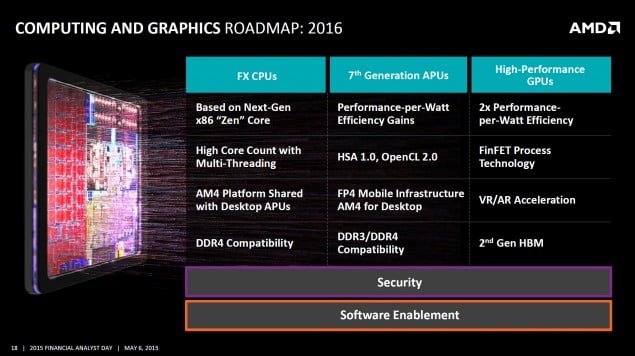 اولین نسل از این پردازنده ها با کد Summit Ridge و نسل هفتم APU ها نیز با کد Bristol Ridge شناخته خواهند شد.ظاهرا معماری APU های این نسل نیز بر پایه 28 نانومتر است.علاوه بر پشتیبانی از حافظه های DDR4،کاربران می توانند شاهد مادربردهایی با استفاده از اسلات توسعه PCIe 3.0 باشند.از سوی دیگر AMD با تمرکز در بهبود مصرف جریان موفق به کاهش حرارت تولیدی نیز شده است.در نهایت امیدوار هستیم که AMD با پلتفرم AM4 و پردازنده های ZEN قدرت خود برای بازگشت به بازار پردازنده ها را مجددا به دست آورد.هر چند که تا کنون نیز زمان زیادی را از دست داده است.