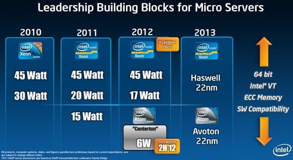 در طرح اولیه ای که اینتل ارائه کرده، سرورهایی در نظر گرفته شده که هم شامل پردازنده های اتم و هم شامل پردازنده های زئون میشود و نرم افزار مخصوصی تصمیم میگرد که در هر لحظه قدرت پردازشی کدام یک برایش کافی خواهد بود. طبق اسلاید منتشر شده توسط اینتل، سال آینده دو پردازنده جدید با نام رمز Haswell و Avoton (که در واقع یک SoC شامل پردازنده ای با معماری اتم است) عرضه خواهد شد تا برنامه های اینتل هرچه بیشتر به واقعیت بپیوندند.