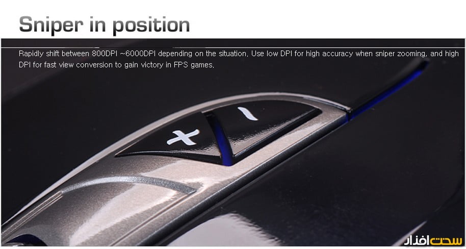 امکان افزایش یا کاهش فوری میزان حساسیت سنسور لیزری Avago 9500 به کار رفته در ماوس، با استفاده از دو کلید موجود روی ماوس، وجود دارد.