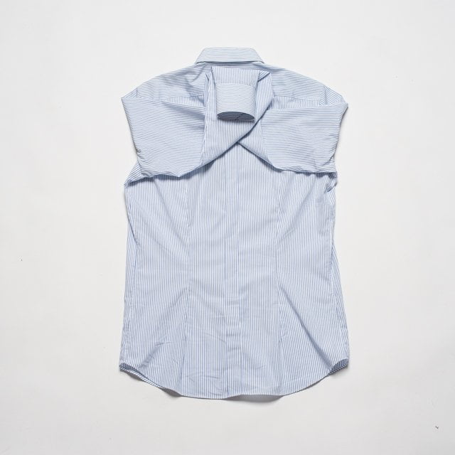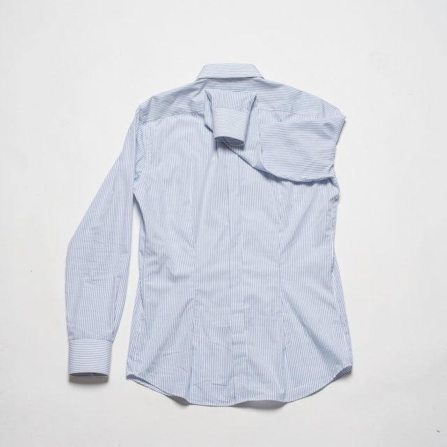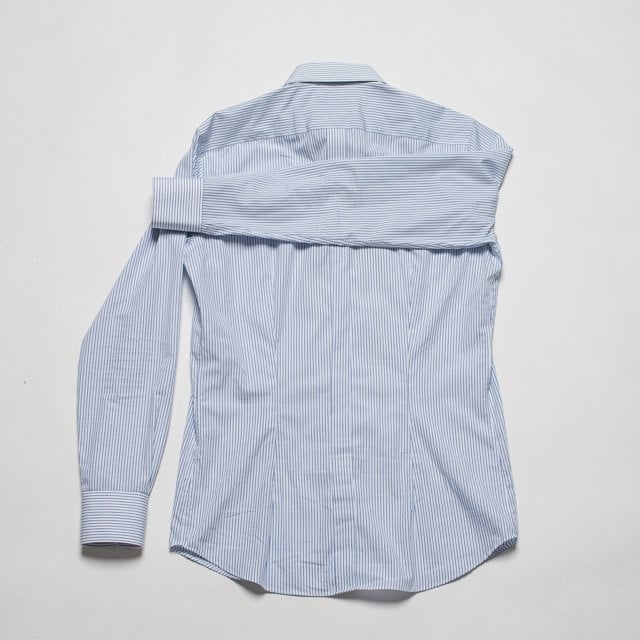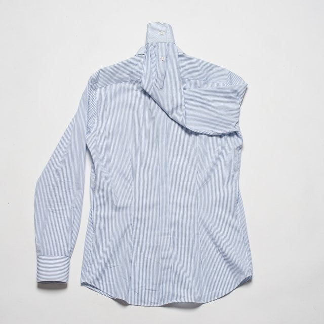 اما پیراهن: اول دکمه های پیراهن را کامل ببندید، آن را برگردانید و آستین سمت راست را روی شانه قرار دهید.