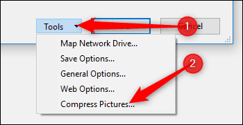 در صفحه باز شده باید بر روی Tools کلیک کنید و با انتخاب گزینه ی Compress Pictures تمامی تصاویر موجود در متن را فشرده نمایید.