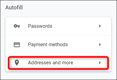 سپس به پایین صفحه بروید و در بخش Autofill بر روی Addresses and more کلیک نمایید.