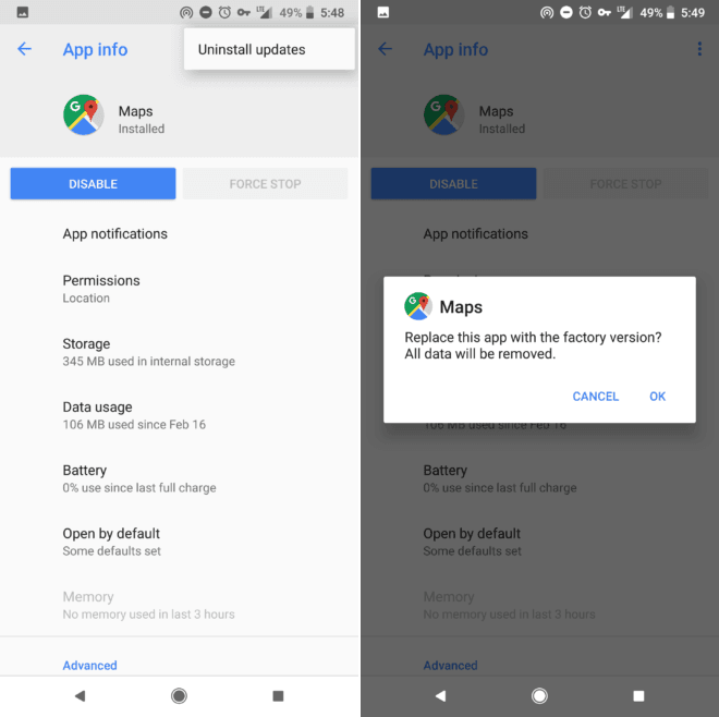 اگر برنامه مورد نظر به صورت پیش فرض بر روی گوشی نصب باشد، متاسفانه شما نمی توانید آن را حذف کنید. اما می توانید با انتخاب منوی سه نقطه در بالای سمت راست برنامه، گزینه Uninstall updates را انتخاب کنید. بدین ترتیب تمام به روزرسانی هایی که برنامه دریافت کرده است، حذف خواهد شد. در نظر داشته باشید که شما نمی توانید نسخه ای قدیمی تر از آنچه که حالا پس از حذف آپدیت ها در گوشی وجود دارد را نصب کنید.