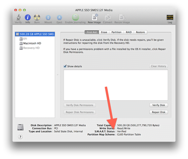برای اطمینان از سالم بودن هارددیسک، اول از همه می بایست وضعیت SMART که مخفف (Self-Monitoring, Analysis, and Reporting Technology) است را بررسی کنید که شامل یک سری از تست ها و کارایی هارددیسک است که مکانیزم فعالیت این قطعه را برای شما به نمایش می گذارد. هنگامی که شما برنامه Disk Utility را اجرا می کنید بعد از اتمام مراحل ذکر شده و پایان بررسی هارددیسک، اگر در پایین پنجره این برنامه جمله ای به غیر از Verified نوشته شده بود متاسفانه شما می بایست هارددیسک خود را عوض کنید.