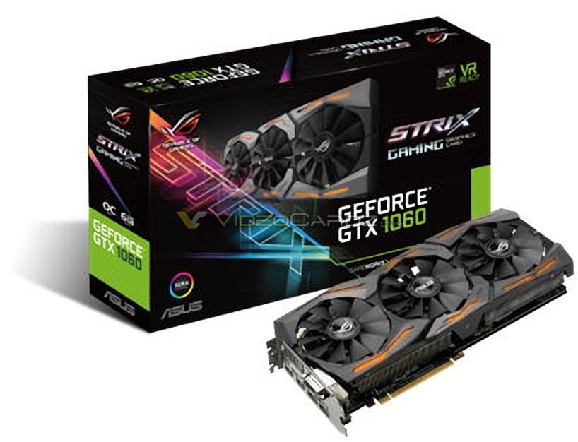 و اما نسخه STRIX از کارت گرافیک GTX1060 نیز رونمایی شده است.سیلیکون GP106 اینبار در کارت گرافیک های قدرتمند STRIX نصب گشته است.این محصول نیز از خنک کننده اختصاصی DirectCU III بهره می برد که سامانه دیودهای نورانی AURA RGB نیز برای آن لحاظ شده است.یک رابط تغذیه 8 پین،وظیفه انتقال جریان اصلی را بر عهده دارد.مدار فاز این محصول از آرایش 6+1 بهره برده و امکان ضعیف بودن نسخه های 3 گیگابایتی وجود دارد.تصاویر اولیه حاکی از آن است که این کارت گرافیک در نسخه 6 گیگابایتی است.
