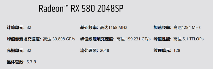 این کارت گرافیک دارای همان 8 گیگابایت حافظه GDDR5 به همراه یک رابط 256 بیتی است. فرکانس تراشه های حافظه آن به 7 گیگابیت کاهش یافته و توان حرارتی نیز 150 وات است. فرکانس GPU در آن تا 40 مگاهرتز بیش از RX 570 و 66 مگاهرتز کمتر از RX 580 اصلی است. سومین نکته، کمبود هسته های سایه زن است؛ RX 580 تقلیل یافته دارای 2048 هسته است.