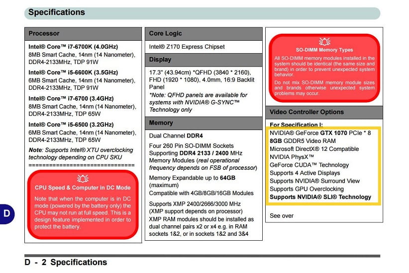 اطلاعاتی که در ادامه شاهد آن هستید،از چند منبع متعبر مانند Notebookreview بدست آمده است.برخی از تولید کنندگان لپ تاپ های گیمیگ،خود را برای عرضه این لپ تاپ ها آماده کرده اند.اما برندهایی مانند CLEVO پا را از این هم فراتر گذاشته و برخی از مشخصات دقیق به همراه نتایج بررسی را در اختیار کاربران و مدیاهای فعال در این زمینه قرار داده اند.لپ تاپ CLEVO P870DM ترکیبی از دسکتاپ و لپ تاپ است که اکثر قطعات آن در کلاس PC هستند.یک مادر Z170 به همراه قابلیت اورکلاک برای این لپ تاپ نصب شده است.در دو پیکربندی از این لپ تاپ ها،شاهد استفاده دیوانه وار از دو کارت گرافیک GTX1070 و GTX1080 به صورت SLI هستیم!