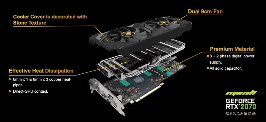 اما در کارت گرافیک Manli GeForce RTX 2070 Gallardo شاهد استفاده از یک خنک کننده بزرگتر با 2 عدد فن 9 سانتی متری هستیم. مدل گالاردو با 5 درصد اورکلاک بیشتر به نسبت نسخه رفرنس دارای فرکانس های 1410 الی 1710 مگاهرتز است. 1 رابط 6 و یک رابط 8 پین نیز نیروی مورد نیاز آن را تامین خواهند کرد. این مدل دارای مدار تغذیه 8+2 فاز رگولاتور است. مزیت این برند، تولید کارت گرافیک با قیمت تمام شده کمتر به نسبت رقبا است.
