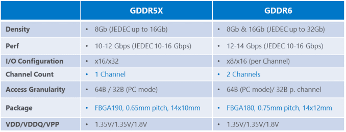 تراشه های GDDR6 دارای گیت های بیشتری هستند که پهنای باند نهایی آنها را به طور چشمگیری افزایش خواهد داد. همچنین پیچیدگی تولید کمتر به نسبت HBM2، قیمت محصول را نیز کاهش خواهد داد. تعداد کانال های GDDR6 به 2 عدد افزایش یافته است و این در حالی است که در حافظه های GDDR5X این تعداد به 1 کانال محدود می گردد.