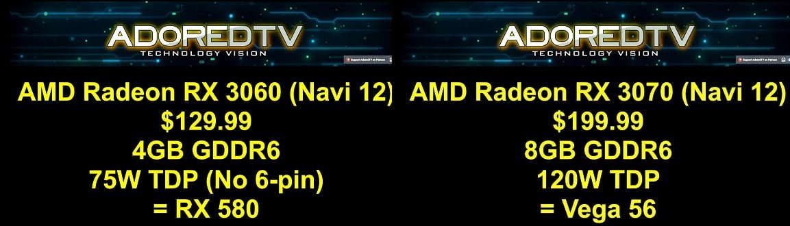 این کارت گرافیک ها از معماری NAVI با لیتوگرافی 7 نانومتری استفاده کرده و اگر اطلاعات درست باشد، این مجموعه از سه سری کارت گرافیک برای جایگزینی نسل فعلی Polaris تشکیل شده است. شایان ذکر است که اطلاعات فوق از سوی ما تائید نشده و تنها نقل قول از خبرگزاری هایی است که این اطلاعات را منتشر کرده اند. به گفته این منابع، RX 3080 رقیب کارت گرافیک RTX 2070 است.