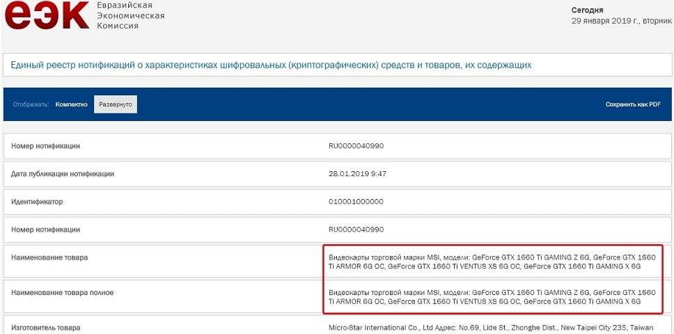 تعداد 4 کارت گرافیک MSI GeForce GTX 1660 Ti در لیست “در وب سایت کمیسیون اقتصادی اوراسیا” درج شده اند که ورود اسامی آنها به این وب سایت، بدان معنی است که به زودی شاهد عرضه آنها در بازارهای جهانی خواهیم بود. این کارت گرافیک ها شامل مدل های MSI GeForce GTX 1660 Ti GAMING Z 6G، MSI GeForce GTX 1660 Ti ARMOR 6G OC، MSI GeForce GTX 1660 Ti VENTUS XS 6G OC و MSI GeForce GTX 1660 Ti GAMING X 6G هستند.