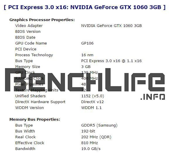 هم اینک تصاویری از منبع Bench Life بدست آمده است که نشان می دهد مشخصات فنی GTX1060 در نسخه های 3 و 6 گیگابایتی با یکدیگر متفاوت است!این منبع که در اکثر موارد اطلاعات ارائه شده از آن به واقعیت می پیوندد،اعلام کرده است که هر دو نسخه GTX1060 از سیلیکون های GP106 بهره می برند.اما ظاهرا این سیلیکون به دو مدل GP106-300 و GP106-400 تقسیم می شود.برخی از متخصصان بر این عقیده بودند که به احتمال بسیار،GP106-300 در کارت گرافیک GTX1050 مورد استفاده قرار می گیرد.در صورتی که گفته های Bench Life حقیقت داشته باشد،انویدیا هر دو سیلیکون را در نسخه های مختلف GTX1060 به خدمت گرفته است.