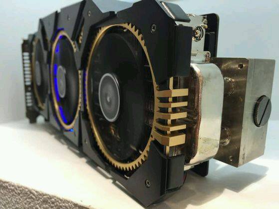 اما اینبار خبری از رادیاتورهای خارجی (External) نیست.تمامی سامانه خنک کننده درون کارت گرافیک کار گذاشته شده است.این کارت گرافیک یک ایده دیوانه وار و جذاب است؛چرا که علاوه بر سیستم خنک کننده،ظاهر آن نیز بسیار متفاوت است.