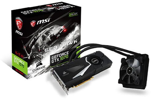 MSI GeForce GTX 1070 Sea Hawk X از یک خنک کننده مایع کمپانی Corsair بهره می برد.هیست سینک و خنک کننده بادی وظیفه دفع حرارت از مدار تغذیه و تراشه های حافظه را بر عهده دارند.اما کولر مایع نیز به طور مستقیم GPU را تحت پوشش دارد.این کارت گرافیک به 8 گیگابایت حافظه GDDR5 و رابط حافظه 256 بیتی مجهز شده است.علاوه بر آن،فرکانس حافظه در آن به 8108 مگاهرتز رسیده است.فرکانس هسته در این کارت گرافیک 1797 مگاهرتز است.در حال حاضر قیمت این کارت گرافیک مشخص نشده است،اما می تواند یکی از بهترین انتخاب های GTX1070 باشد.ساکت و خنک.
