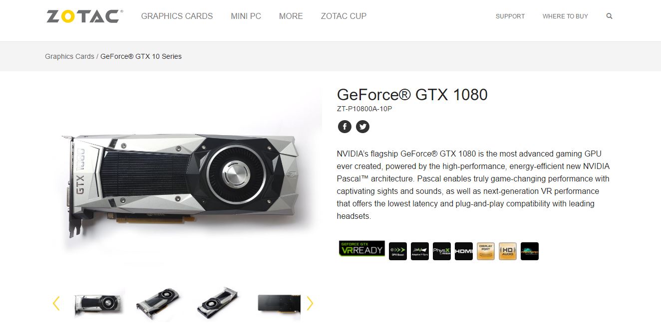 این کارت گرافیک با شناسه ZT-P10800A-10P شناخته می شود.مشخصات فنی این محصول تفاوت چندانی با نسخه مرجع ندارد.فرکانس کاری هسته در حالت پایه 1607 و در حالت افزایشی (Boost) به 1733 مگاهرتز می رسد.به احتمال بسیار زیاد،این فرکانس در اورکلاک به میزان 2 گیگاهرتز نیز خواهد رسید.همچنان شاهد 2560 هسته CUDA هستیم.8 گیگابایت حافظه GDDR5X نیز برای آن در نظر گرفته شده است.لازم به ذکر است که هنوز اطلاع دقیقی از تعداد واحد های TMU و ROP در دست نیست.فرکانس موثر حافظه در این کارت گرافیک 10 گیگاهرتز است.اتصال برق همچنان از طریق یک رابط 8 پین تامین می گردد و مصرف انرژی نیز 180 وات ذکر شده است.منبع تغذیه پیشنهادی برای این کارت گرافیک،500 وات است.توانایی SLI،پشتیبانی از ویندوز های ویستا الی 10،توانایی اجرا در حالت Quad Display،پشتیبانی از HDCP،پشتیبانی از دستورات کتابخانه ای مدرن مانند DX12-1 و OpenGL 4.5 از جمله دیگر ویژگی های این کارت گرافیک است.