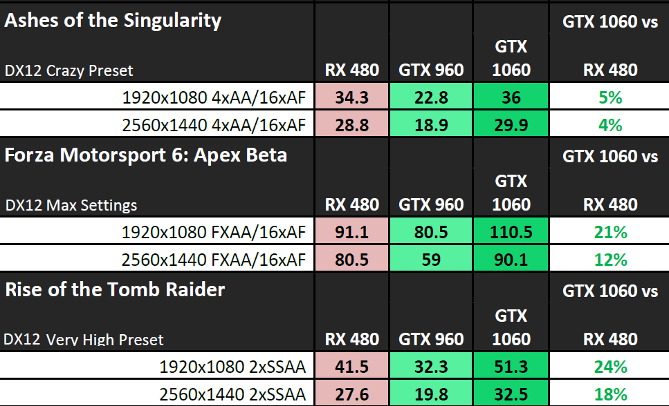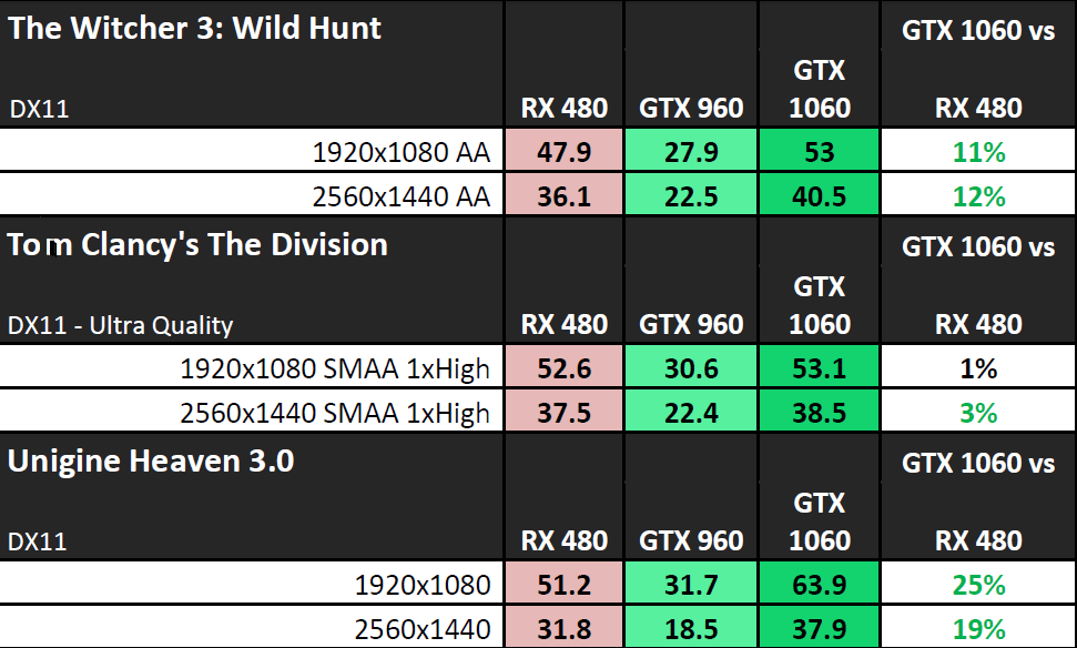 بنچمارکهایی که به تازگی منتشر شده اند،سه کارت گرافیک GTX1060،GTX960 و RX480 را در برابر یکدیگر قرار داده اند.این رویارویی در اجرای بازی ها انجام گرفته و به طور عمده دقت های FHD و 1440p مد نظر قرار داشته اند.کتابخانه های DX11 و DX12 نیز در این تست حضور فعال دارند.کارت گرافیک GTX1060 چیزی در حدود 15% از کارت گرافیک RX480 سریعتر ظاهر شده است.این بنچمارک،می تواند در انتخاب کارت گرافیک مناسب برای کاربران،بسیار مورد توجه قرار گیرد.