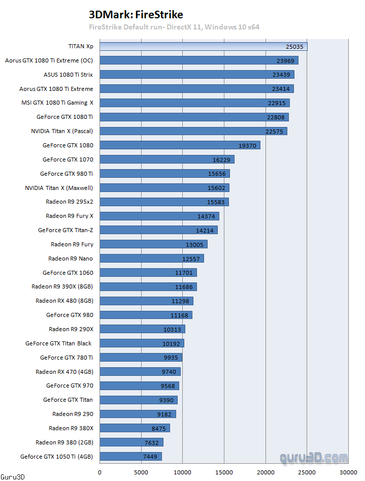 کارت گرافیک NVIDIA Titan Xp در برابر کارت گرافیک سفارشی  Aorus GTX 1080 Ti قرار گرفته است. تایتان اکس پی در فرکانس 1974 مگاهرتز اورکلاک شده است؛ کارت گرافیک سفارشی  Aorus GTX 1080 Ti چیزی در رنج 11% سریعتر از نسخه رفرنس بوده با این وجود باز هم بازی را به TITAN Xp واگذار کرده است. تایتان جدید امتیاز 25035 را به نام خود ثبت نموده است و این در حالی است که نسخه  Aorus GTX 1080 Ti امتیاز 23969 را به نام خود زده است. کارت گرافیک GTX1080 Ti در مدل های سفارشی خود به زودی راهی بازار می گردد. کارت گرافیک TITAN Xp مانند گذشته در انحصار NVIDIA باقی مانده و نسخه سفارشی از آن تولید نخواهد شد.