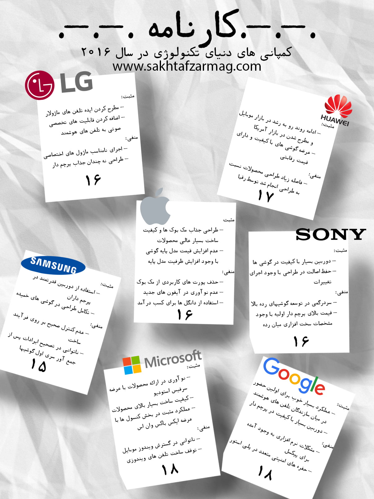 سال 2016 میلادی نیز به پایان رسید. تمامی شرکت های فعال در دنیای دیجیتال تلاش کردند در این سال محصولات و خدماتی با بهترین کیفیت را در اختیار کاربران قرار دهد و از طرفی مشکلات بسیار زیادی نیز برای این کمپانی ها به وجود آمد. از حفره های امنیتی تا آتش سوزی و انفجار. اما حالا زمان مناسبی برای سنجیدن عملکرد این شرکت ها در سال 2016 است. در این بخش از اینفوگرافی، کارنامه تعدادی از این شرکت ها را با هم مرور خواهیم کرد. در قسمت دوم اینفوگرافی کارنامه شرکت های دنیای دیجیتال به سراغ تعدادی دیگر از این کمپانی ها خواهیم رفت. نظر شما درباره نمرات داده شده به هر یک از این شرکت ها چیست؟