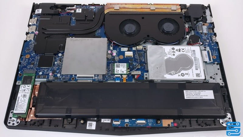 سخت افزارهایی که در این لپ تاپ به کار رفته است شامل یک پردازنده ی نسل هفتمی اینتل در مدل Intel Core i7-7700HQ، مقدار 16 گیگابایت حافظه رم DDR4، کارت گرافیک NVIDIA GeForce GTX 1050Ti به همراه 4 گیگابایت حافظه اختصاصی، نمایشگر 15.6 اینچی با دقت FHD، یک هارد دیسک 1 ترابایتی به همراه یک درایو SSD در ظرفیت 512گیگابایت است. ظاهر نوت بوک بی شباهت با دیگر مدل های لنوو نبوده و یک صفحه کلید با قابلیت LED RED Back light نیز برای آن در نظر گرفته شده است. در ادامه به کالبدشکافی این لپ تاپ خواهیم پرداخت. شایان ذکر است پیکربندی در این نوت بوک می تواند متفاوت باشد. در کابینت زیرین شاهد یک بخش باز به همراه توری ضد گرد و غبار هستیم. این بخش به عنوان هواگیر دمنده های خنک کننده تعبیه شده است. باز کردن درب زیرین بدون مشکل و پیچیدگی خاصی روی می دهد. پس از باز کردن درب زیرین کابینت اصلی، تمامی قطعات مهم قابل رویت بوده و در دسترس هستند.