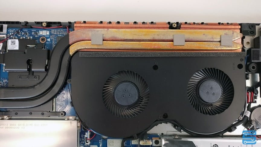 و در نهایت به سیستم خنک کننده می رسیم؛ سیستم خنک کننده به نسبت سخت افزارهای به کار رفته در آن تعریفی ندارد و مانند نوت بوک Lenovo Y700 بدون تغییر و دست نخورده باقی مانده است. هیت پایپ ها از هر دو تراشه ی مهم یعنی CPU و GPU عبور کرده اند و توسط دو فن خنک می گردند. اگزوزها نیز همچنان به سمت عقب است. اما هیت پایپ ها به طور عجیبی در جلوی فن ها قرار گرفته است. هیت پایپ ها در جلوی فن ها بر روی یک هیت سینک قرار گرفته اند که ظاهرا مسی است.